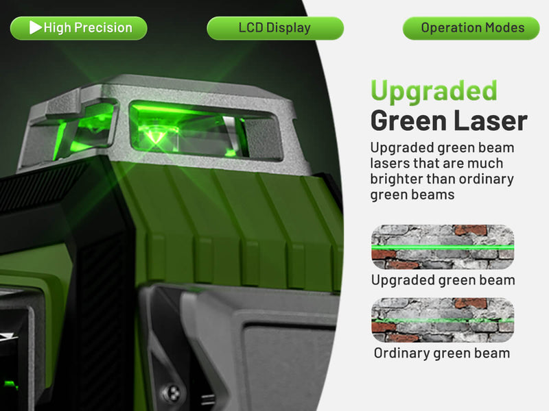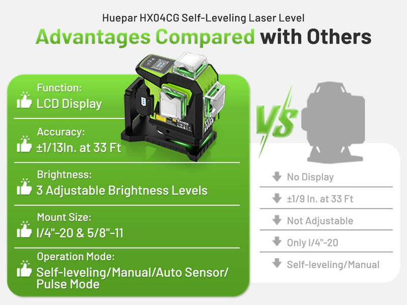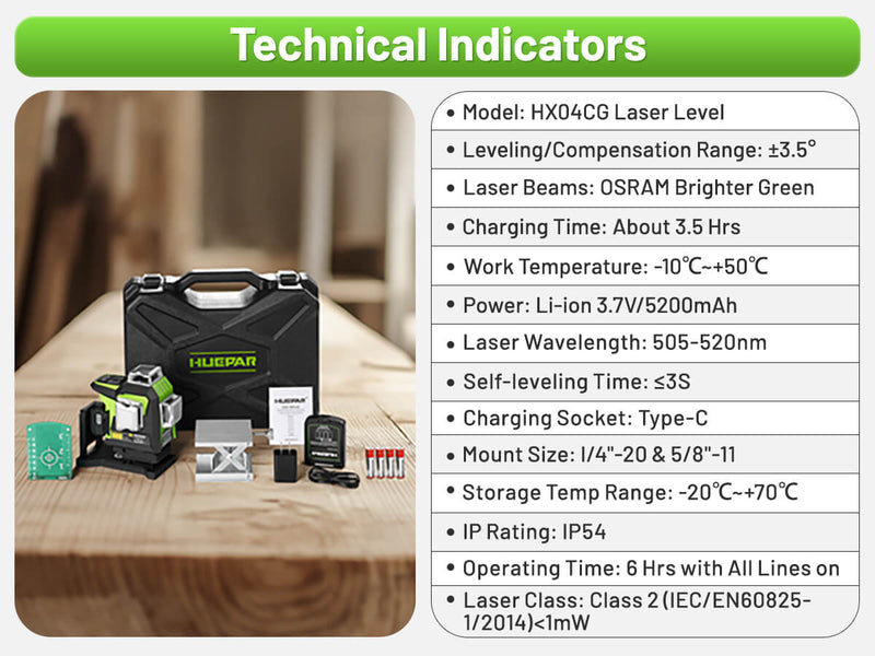 Explore las extraordinarias capacidades del Huepar HX04CG, que incluye un láser de haz verde mejorado con un brillo muy superior al de los haces convencionales. Ya sea que esté trabajando en un gran proyecto de construcción o en una tarea de bricolaje en casa, esta herramienta ofrece una línea de referencia más brillante y nítida que garantiza precisión y eficiencia en cada trabajo.