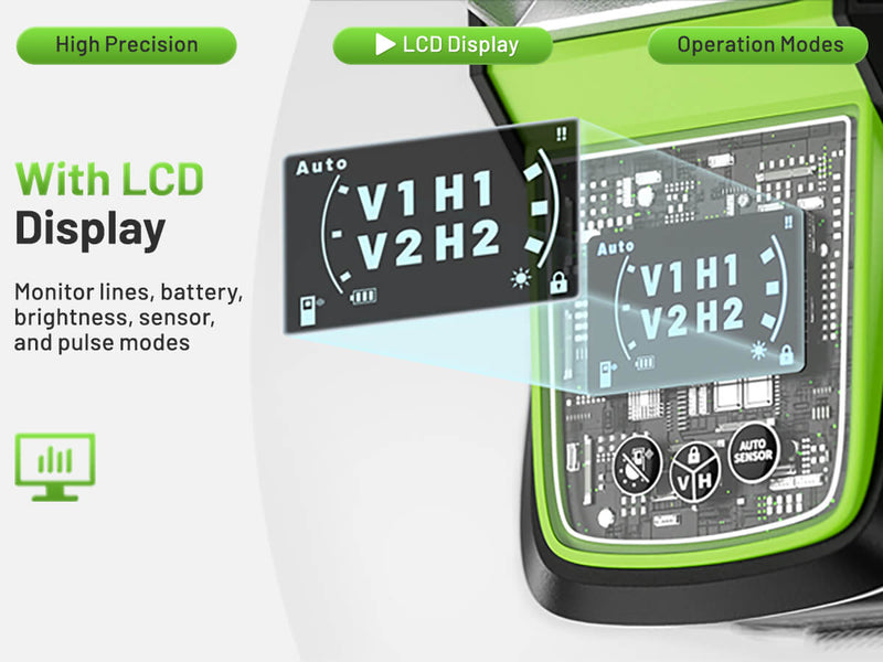 El Huepar HX04CG tiene una pantalla LCD moderna, que proporciona una experiencia de monitoreo intuitiva que hace que el flujo de trabajo sea más inteligente. Con la pantalla LCD, puede rastrear fácilmente el estado de funcionamiento del láser: monitoreo en tiempo real de los modos de línea láser, nivel de batería, ajustes de brillo, estado del sensor y conmutación de modo de pulso. Todas las informaciones a la vista hacen que la operación sea más conveniente y le ayuda a mantenerse eficiente en diversos entornos de trabajo, lo que le permite lograr precisión y eficiencia sin esfuerzo.