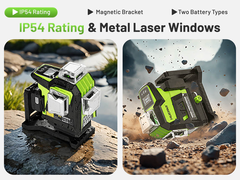 Construido para resistir los elementos, el Huepar HX04CG ofrece protección IP54 contra agua y polvo, garantizando la fiabilidad en las condiciones más duras. Su construcción robusta presenta ventanas láser metálicas para mayor durabilidad, proporcionando un rendimiento óptimo incluso en entornos difíciles.