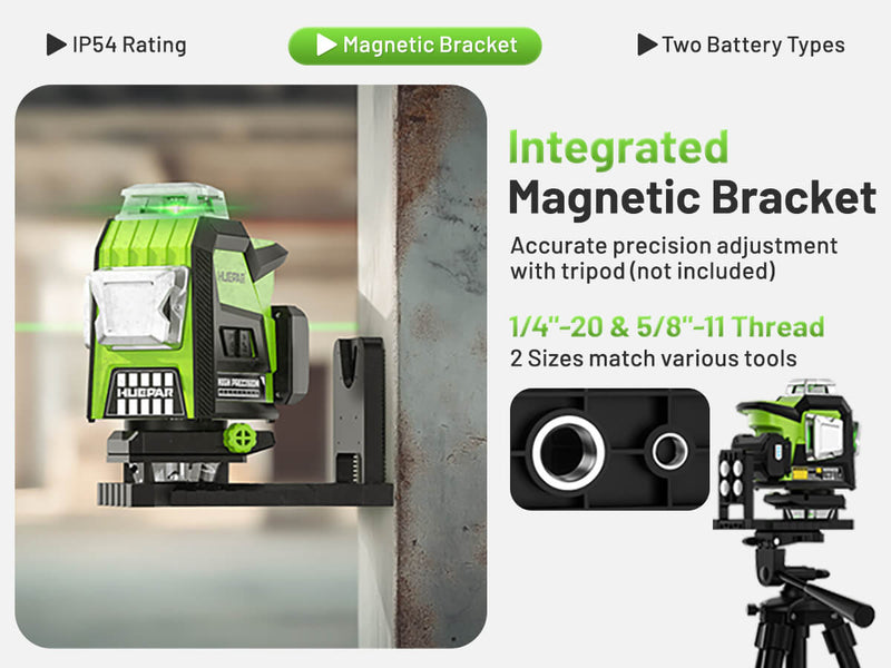 El Huepar HX04CG viene con un soporte magnético de 360° de funciones múltiples, diseñado para una versatilidad sin esfuerzo. Ya sea que esté posicionando el dispositivo en una pared, una columna o usando un tripie (no incluido), este soporte proporciona soluciones de montaje flexibles, garantizando una alineación precisa en cualquier escenario.