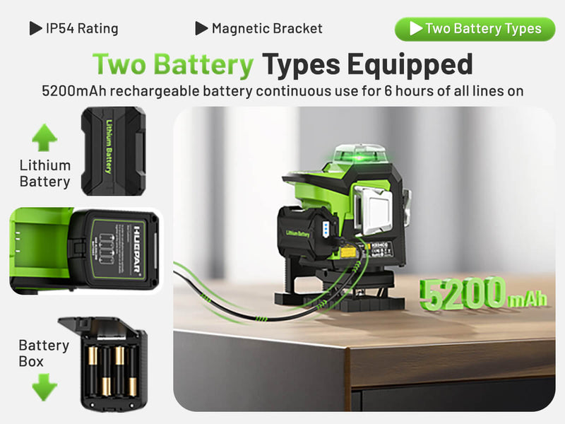 El Huepar HX04CG ofrece dos opciones de batería, le brinda la libertad de elegir entre una batería de litio de 5200mAh potente o una caja de baterías conveniente. Labatería de litio recargable de 5200mAhpermite el uso continuo durante hasta 6 horas con todas las líneas activas, garantizando un rendimiento duradero en proyectos exigentes. Alternativamente, lacaja de bateríasofrece flexibilidad al permitir el uso de baterías AA estándar, proporcionando un respaldo confiable cuando sea necesario. Este diseño cuidadoso mantiene su trabajo sin interrupciones, le brinda el poder de mantenerse productivo, sin importar la tarea que tenga.